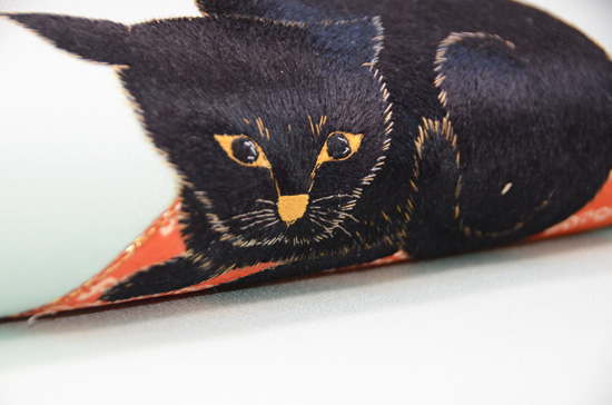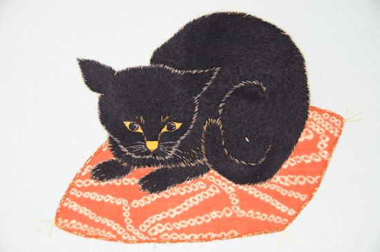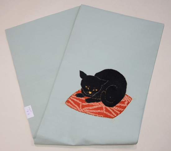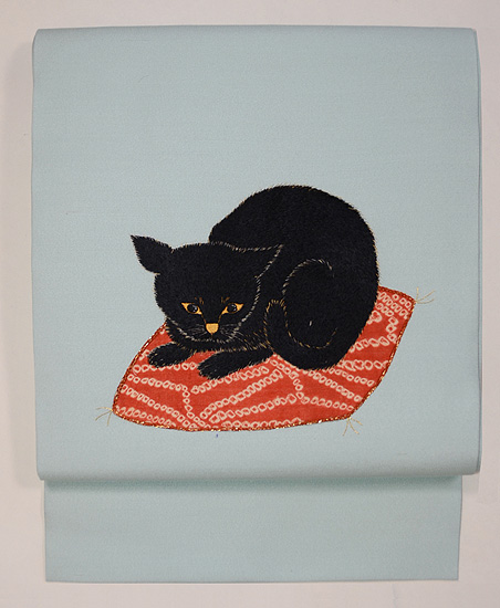 赤いおざぶに黒猫、前柄は、桜の創作帯です。