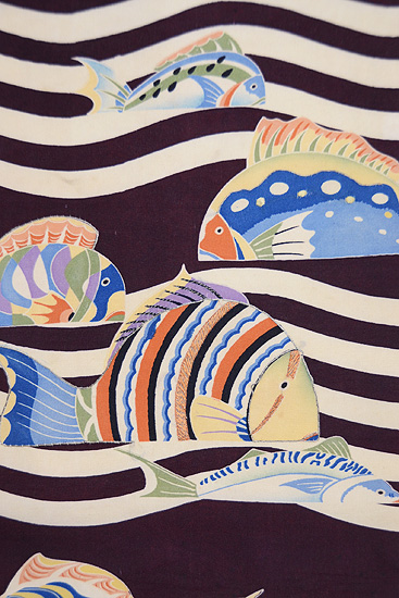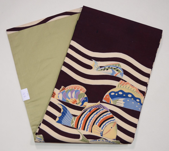 アンティーク着物からお仕立てしたもので、シックな色合いに愛嬌のある魚たちが楽しい帯。