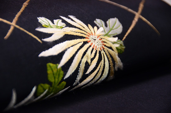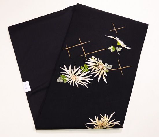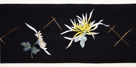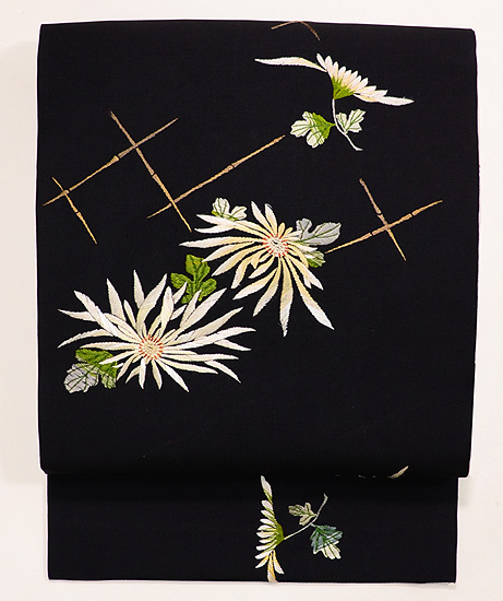 黒地に咲く白菊が、芳しき香りを放つ刺繍帯。