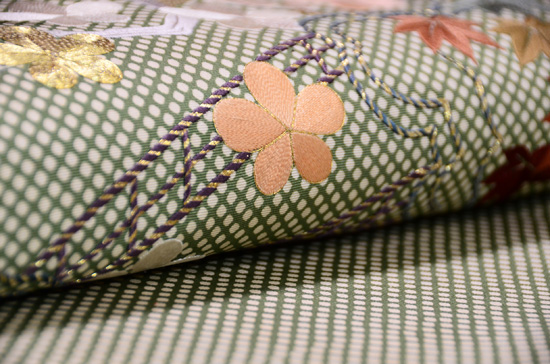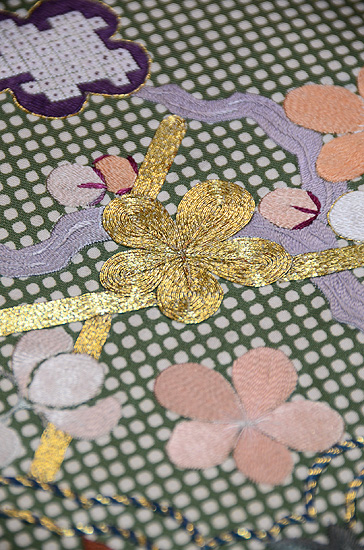 ぽってりとした刺繍が贅沢な背景に囲まれて、豪奢な帯ができあがりました。