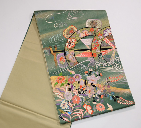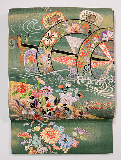 秋の小花と水車の刺繍袋帯