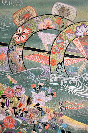花紗綾形の地紋に流水は摺箔、岸辺は疋田絞りという背景の両岸に、梅と紅葉が配されています。