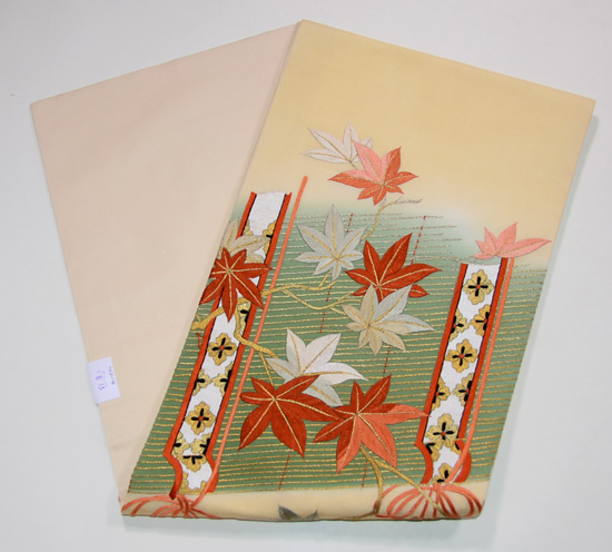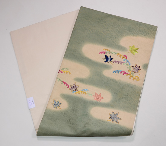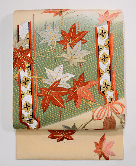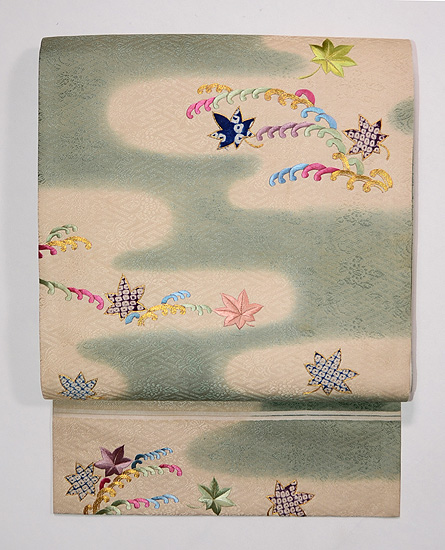 小波と楓の葉が戯れ、夢の国へ誘ってくれるようなやさしい世界感の素敵な刺繍帯です。