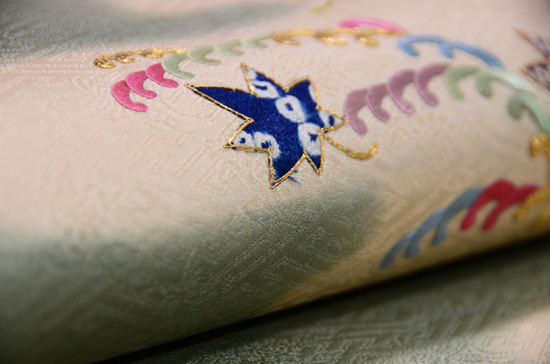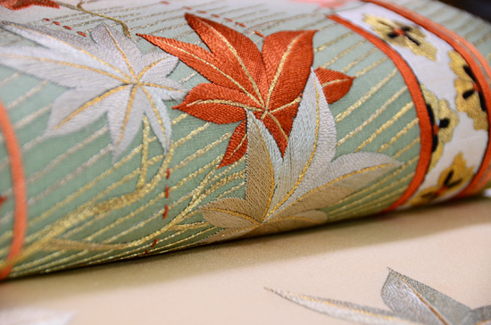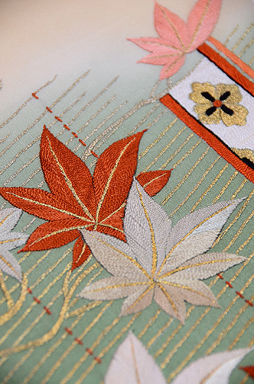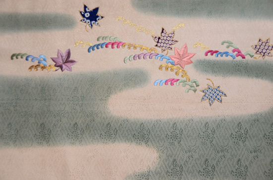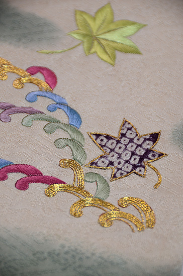 塩瀬地に小紋を染めてその上から刺していますが、大きな紅葉の葉っぱだけが小紋の後ろにあるように刺されています。