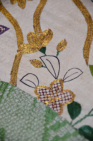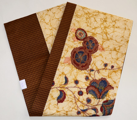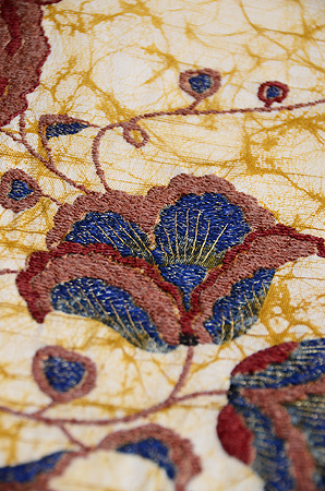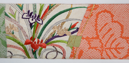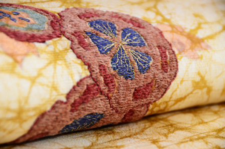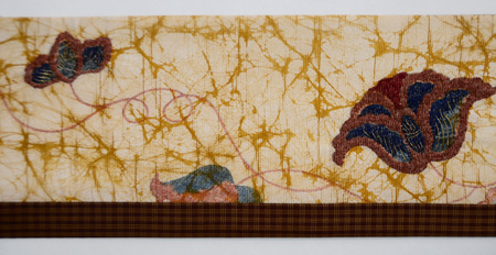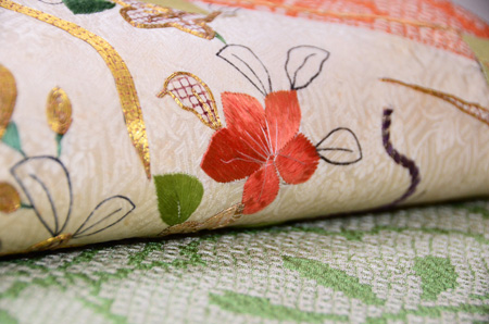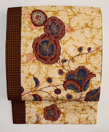 臈纈染めのような布地に西洋刺繍がしてあり、黄八丈を添えてモダンな帯によみがえりました。