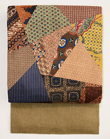 この帯は、かな文字と極小市松紋の布で接ぎました。