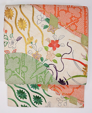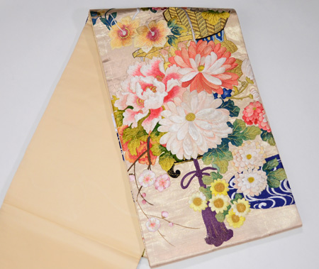尾形光琳風の図に美しい花々が、咲き誇る刺繍帯、元は、丸帯でした。