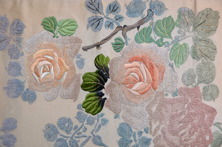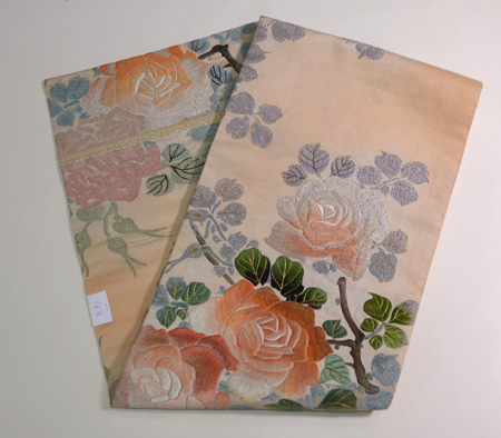 名古屋帯、半幅帯、角帯と続きますが、珍しい物として、刺繍の帯、綿唐山の帯もあります。