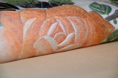 この帯を見ていると、孔雀という鳥は刺繍のテーマとして、最もふさわしいもののように見えてきます。