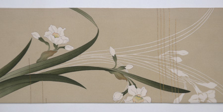 扇面暈しのなかに、梅と鶯が浮き上がってくるやさしいけれど、迫力のある帯です。