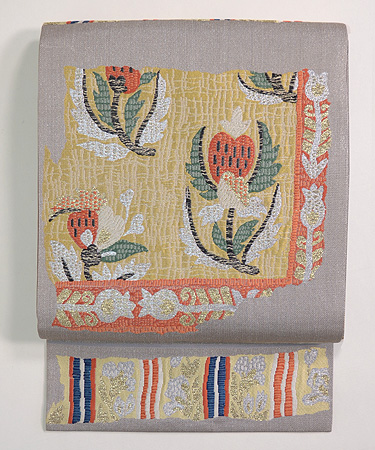明るいベージュ地に残紙糸が無尽に走り、美しいエレガントな帯になっています。