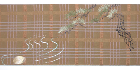 リズミカルな波と梅枝、しゃれた装飾性もそっくりに、金箔のベースを織りで見事に表現しています。