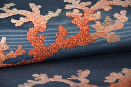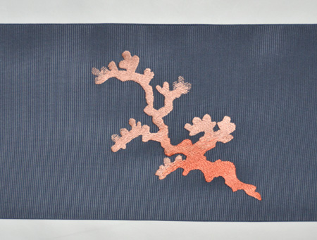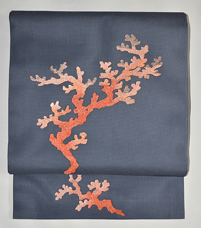 深海の中をのぞき見るような藍鼠いろの地に、上品なグラデーションの珊瑚が浮かび上がる幻想的な帯。