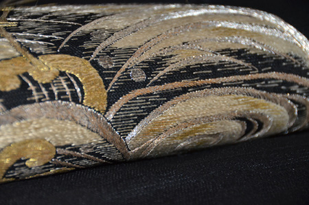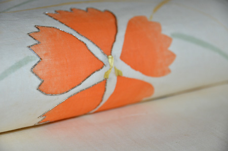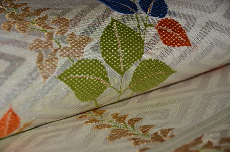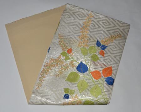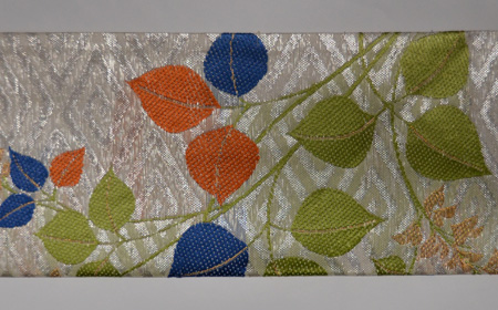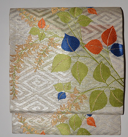 白地に銀糸稲妻文の上に黄赤、留璃紺、萌木色の葉と金の花が、織られています。