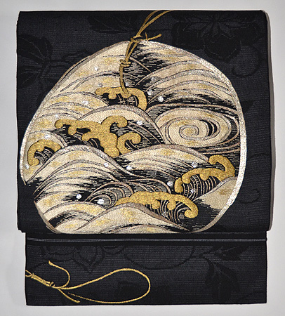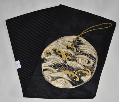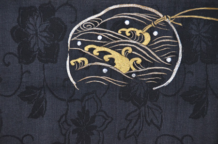 鉄線の地紋の上に大鈴、その中に波頭が刺されています。