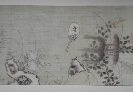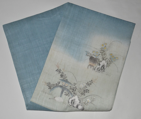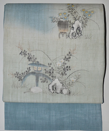 越後上布に秘色と薄藍が、ぼかしで染められ、秋草を背景にうつし出された庭の図をお太鼓におきました。