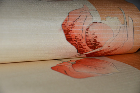 両脇にある杏色のラインが、生成り地に浮かんだ柄を引き立てます。