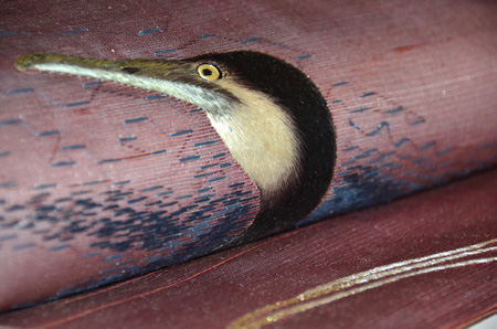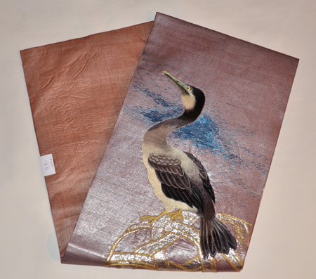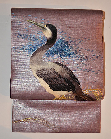 くっと前を見据えた鵜の表情が印象的な刺繍帯です。