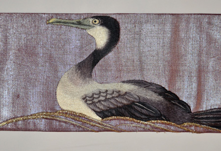 鵜が全て刺繍で表されており、細部の毛色のグラデーションが見事に表現され、技術の高さを感じさせます。