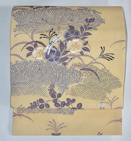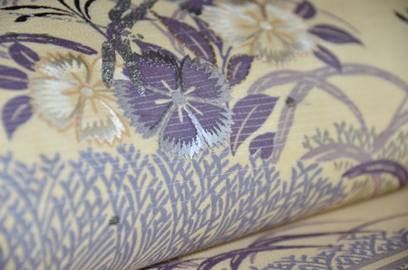 アイボリーの変則的な透かしの入った絽縮緬地に、撫子と萩が染められた名古屋帯です。