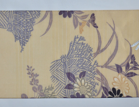 桔梗のような花と丸繋ぎの文様が染め抜かれた名古屋帯です。
