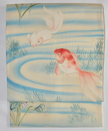 水面の水色、水草の緑、金魚の赤の紅色の色彩のバランスがよく、染め帯ならではの美しさを漂わせています。
