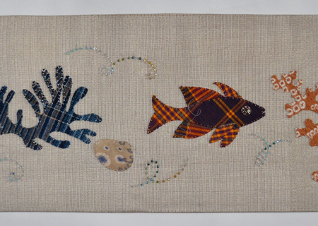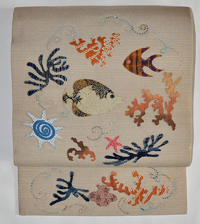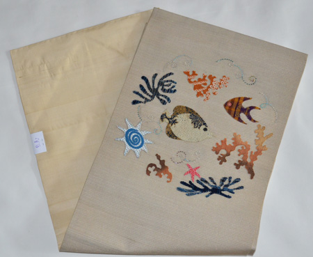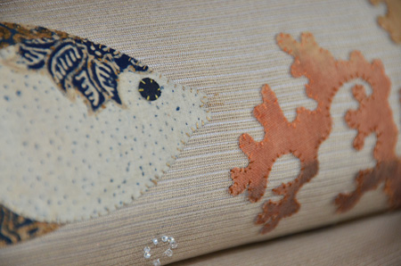 少し光沢のあるベージュの帯地は優しい印象で、パッチワークの魚たちを引き立てます。