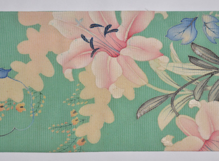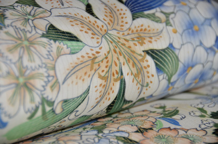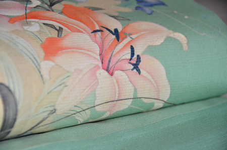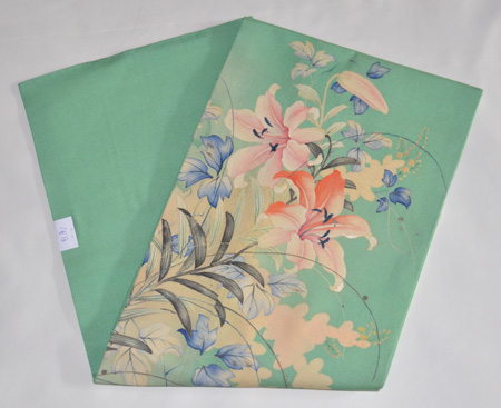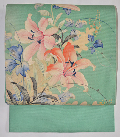 ハッと目を引くエメラルドブルーの地に野の花と百合が描かれた華やかな帯です。