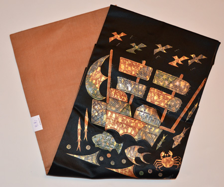 繻子地にアクリル絵の具で帆船とカモメ、お魚さかな達が描かれています。