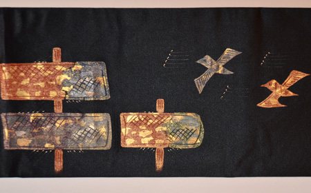 薄い生成りの帯地に、円をイメージして描かれた蝙蝠が気持ちよさそうに飛んでいます。