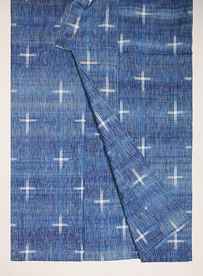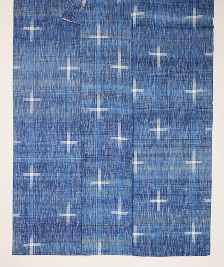 藍の濃淡の中に雨絣が走り、その上に白十字がポッカリと浮いています。