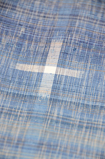 十字の縦の絣足は、明かるい藍に繋がれて次の十字へと導かれています。
