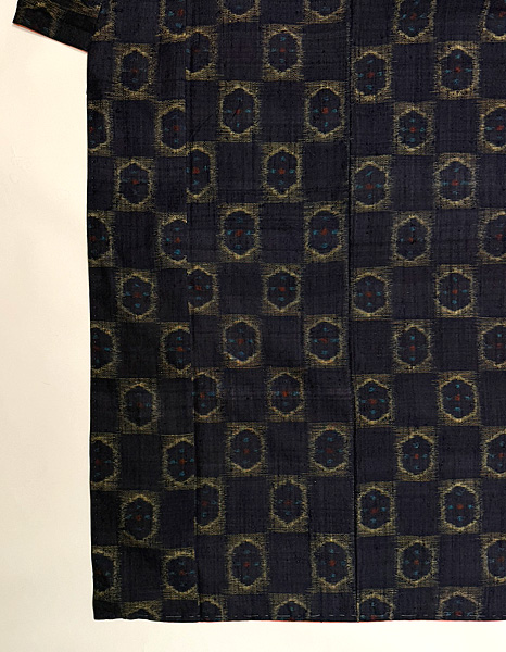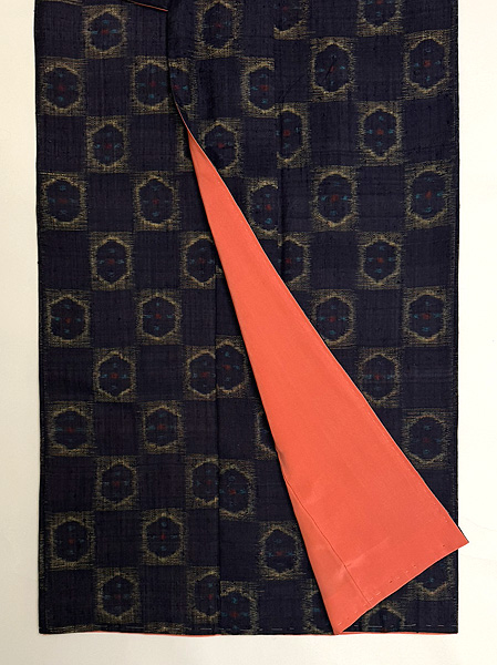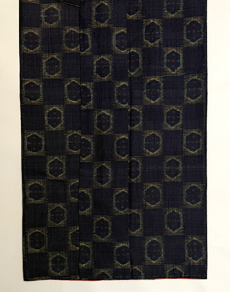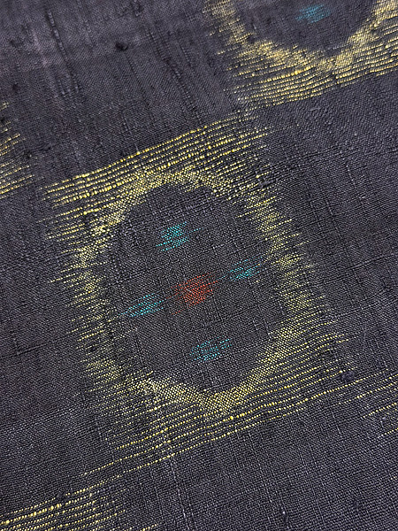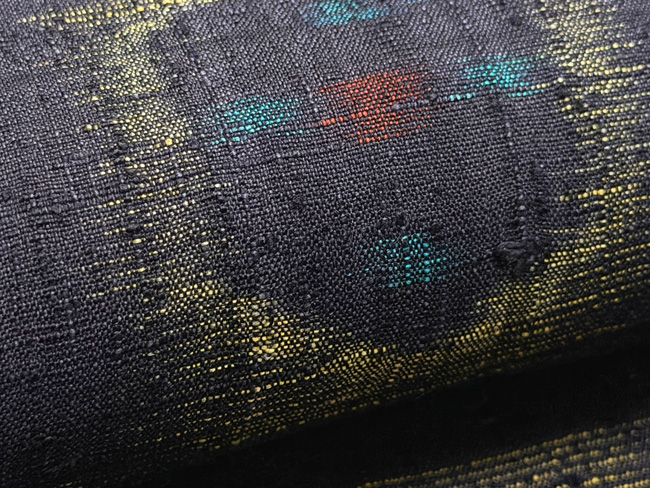 黄色、青、赤色の糸を使って織り出された大胆な絣は可愛らしくもあり、黒地に映えてかえってモダンな着物と呼べそうです。