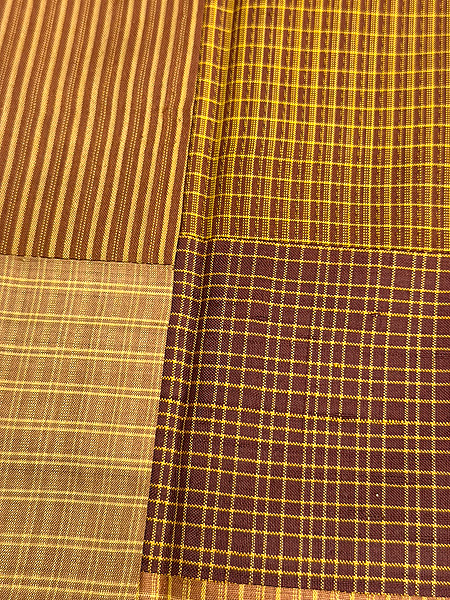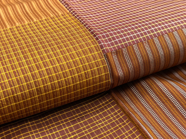 砥の粉色の地に山吹色と錆浅葱色の横縞のぜんまい紬。