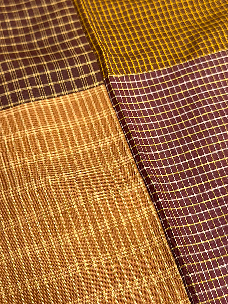 黄樺黒の黄八丈基本3色を植物染料で染め上げ、織りは綾織の逸品です。