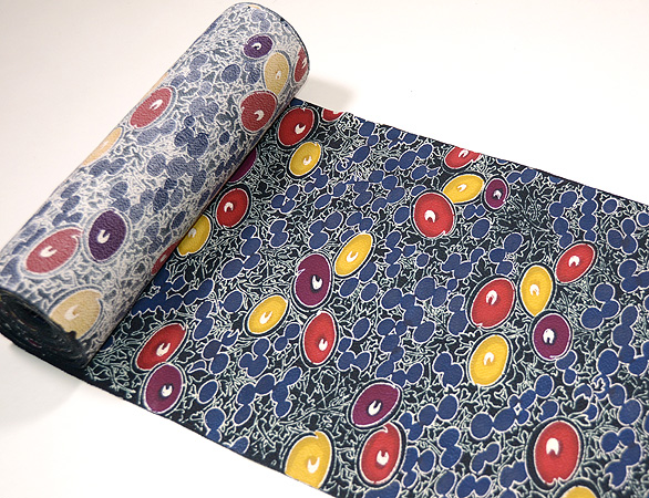 型染めするのが、ただでさえ難儀な鬼縮緬に2種類の型を重ねて染めています。