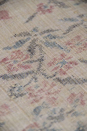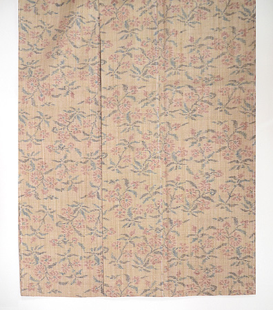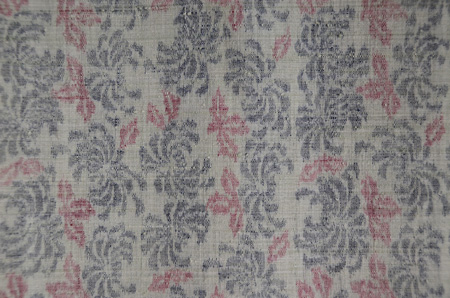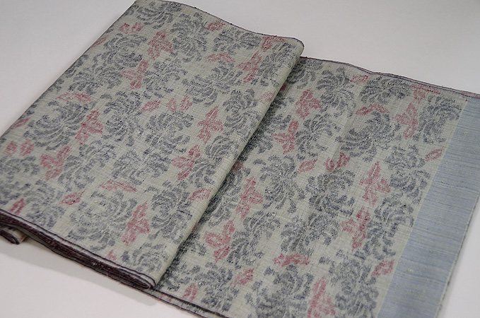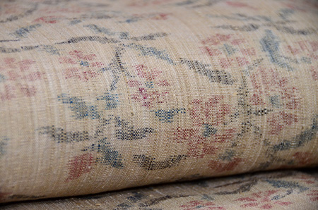 薄い麦わら色に咲く赤い小花の小紋絣。