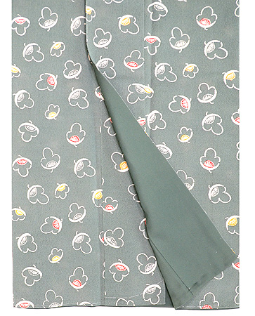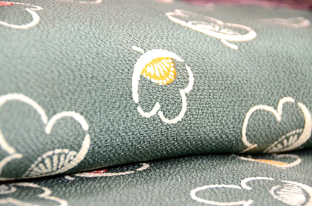 納戸茶(緑を帯びたあさぎの染色)の鬼縮緬に可愛い椿の小紋です。