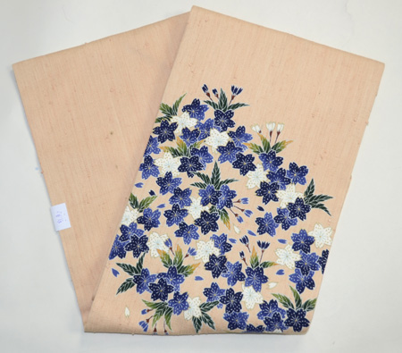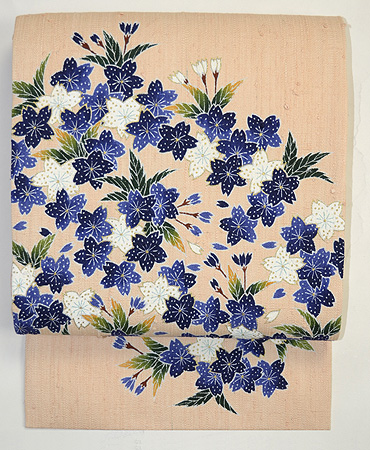 薄い杏色の経節紬に、満開の桜が手描き友禅された名古屋帯です。