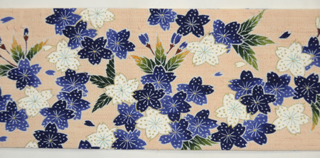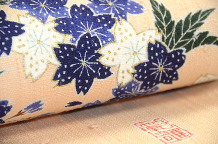 珊瑚色に焼き物の三島手印花文様を思わせる、可愛い小花が並んでいます。