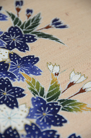 文様に使われている京紫、薄紅色、墨色、水色と日本の伝統色の中でも少しくすみのある色が用いられることによって平面ながら奥行きのある、優しい雰囲気となっています。