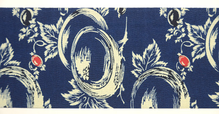 藍地木綿に絵巻と七宝つなぎが、型染めされた浦野理一の名古屋帯です。