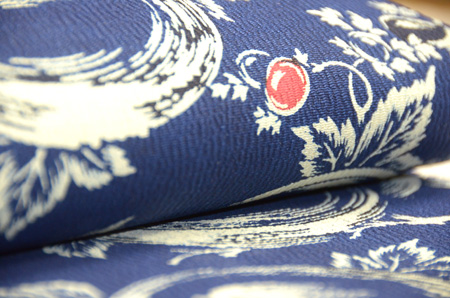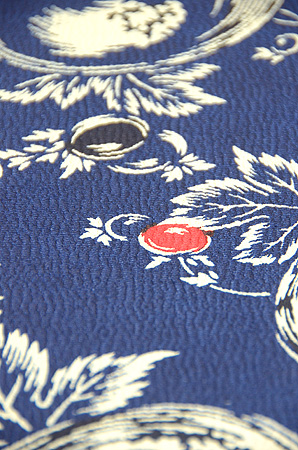 白地鬼シボ縮緬に、墨黒と朱赤の型染めです。