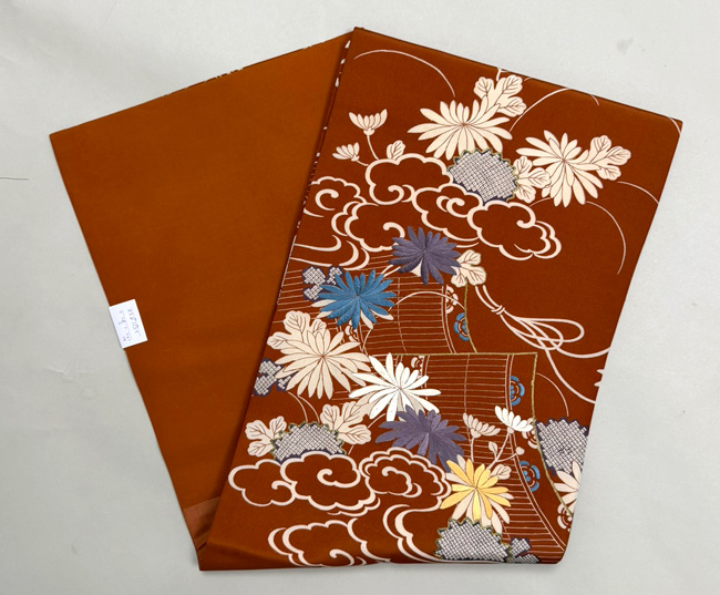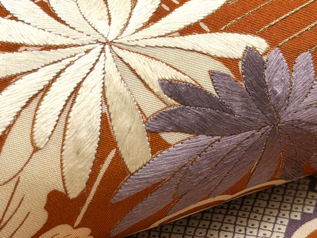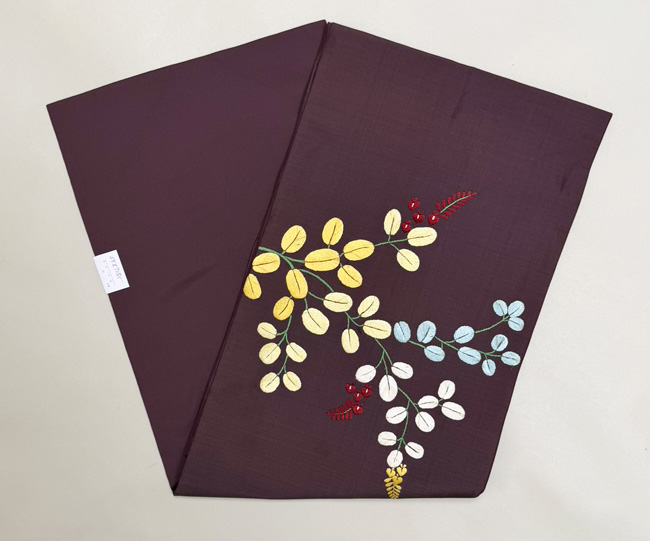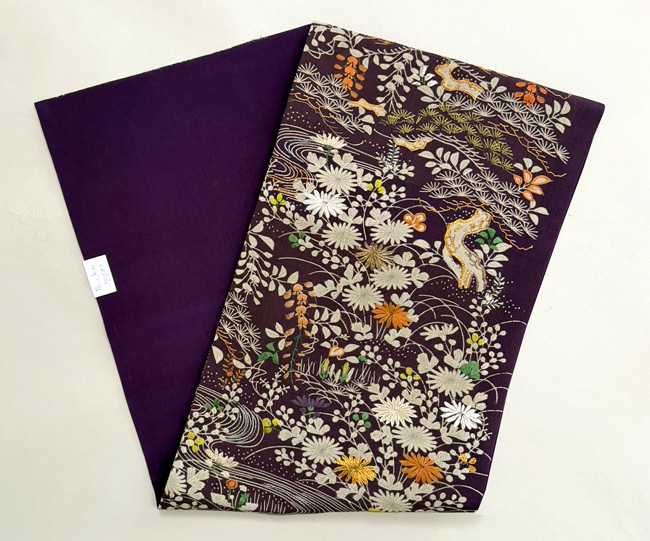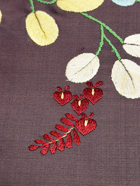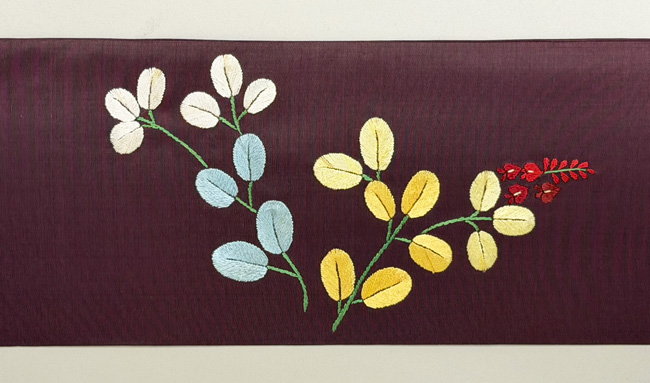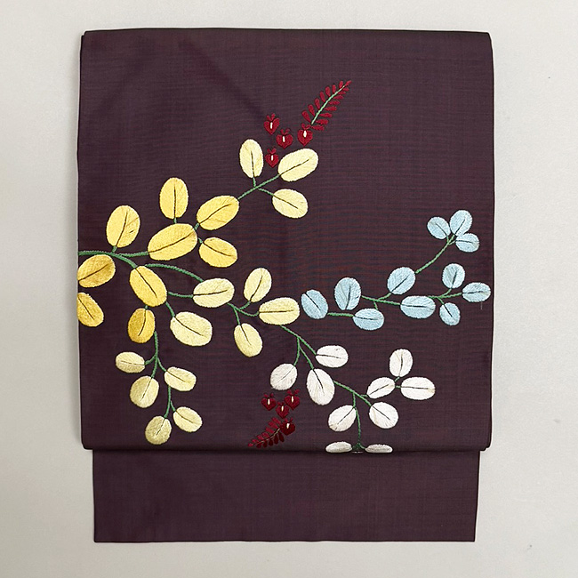 葡萄色に近い濃茶の塩瀬にカラフルな萩を刺繍したかわいい帯。