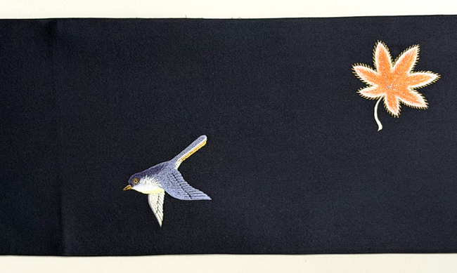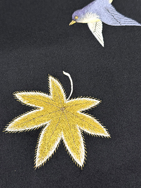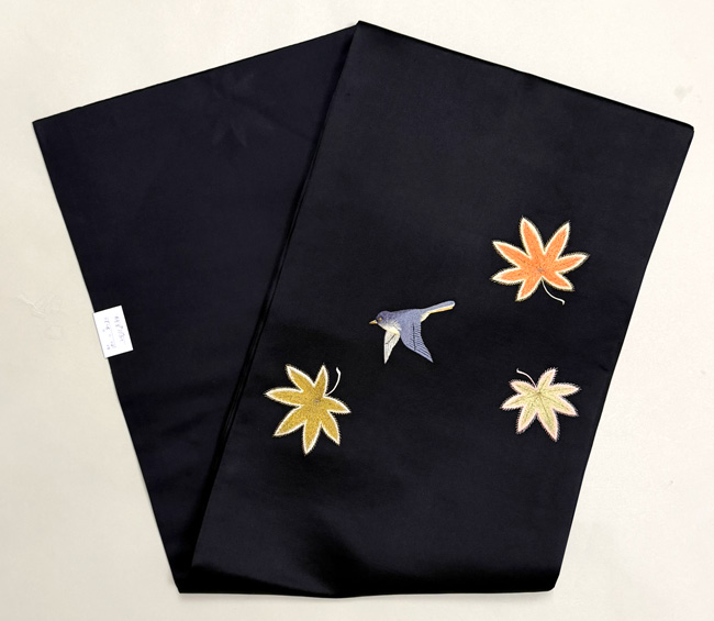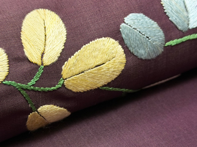 刺繍の黄・水色・生成り・臙脂、どれもお着物に合いやすい色目、秋におすすめの一本です。