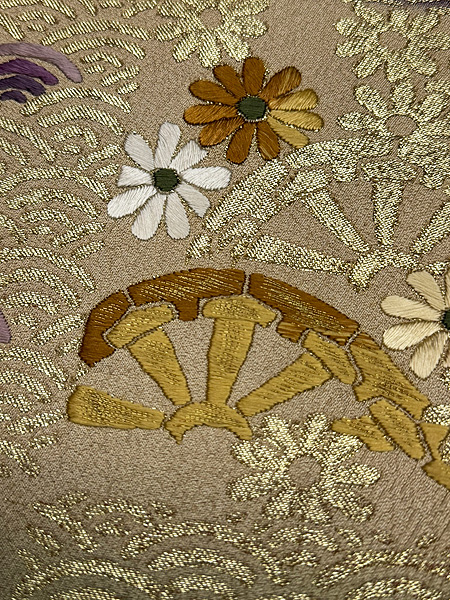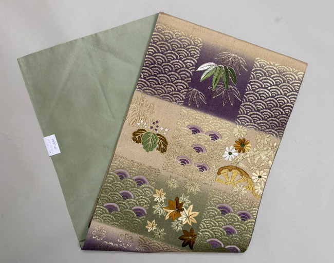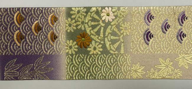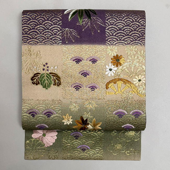 白茶、抹茶、滅紫の横段に金糸の青海波文や梅・菊を織り出した中に、色糸で笹竹・紅葉・源氏車・桐などが市松割りに刺繍であらわされた豪華で可愛さもある帯です。