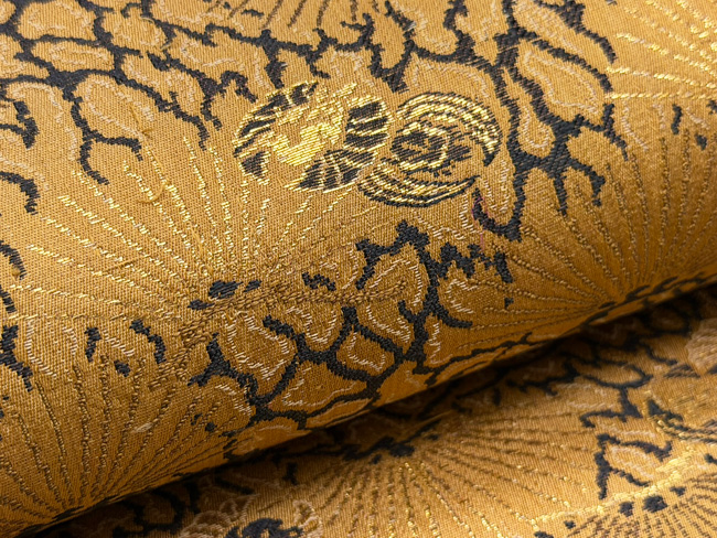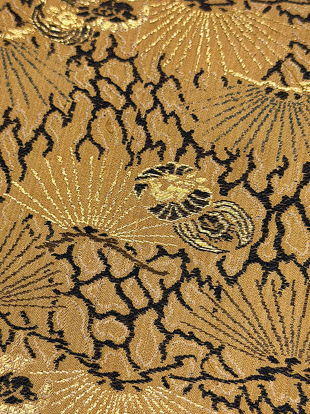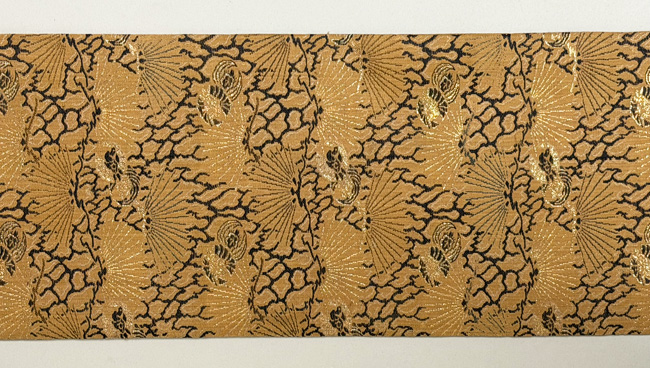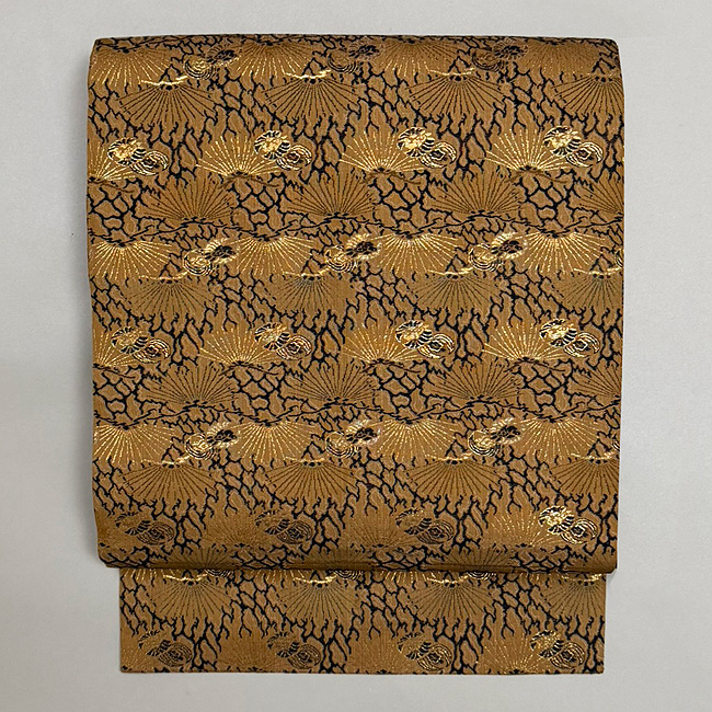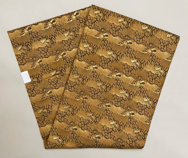 黄土色地に金糸で松の葉、鶴亀といういかにもお目出度い図柄の織帯です。