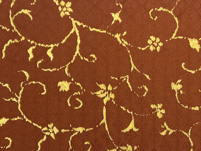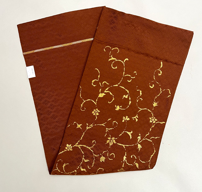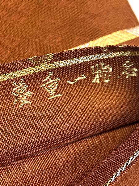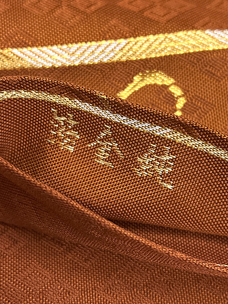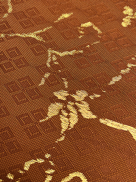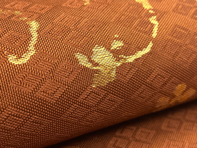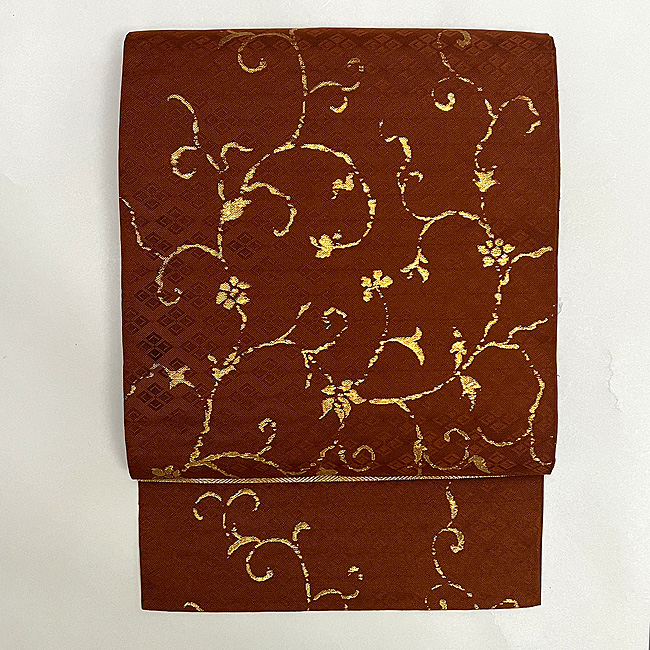 赤みを帯びた茶の地に、有職菱の地紋が織り込まれて、上に純金箔の一重葛が華麗な輝きを放っています。