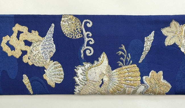 さわやかな瑠璃紺に洲浜文が織り出され、金銀糸の貝尽くしが浮かんで、華やぎの中にも上品な趣が見られます。