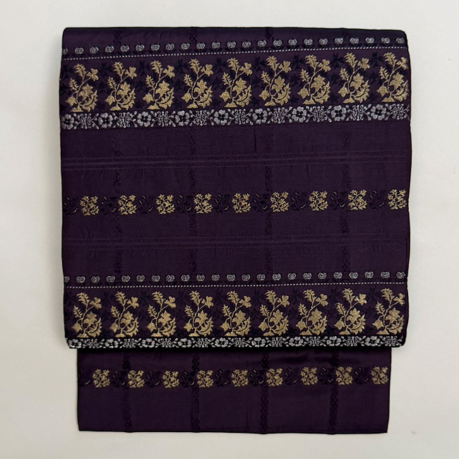 金の小さな唐草がモダンな開き名古屋帯です。深みのある色合いが秋冬にぴったり。